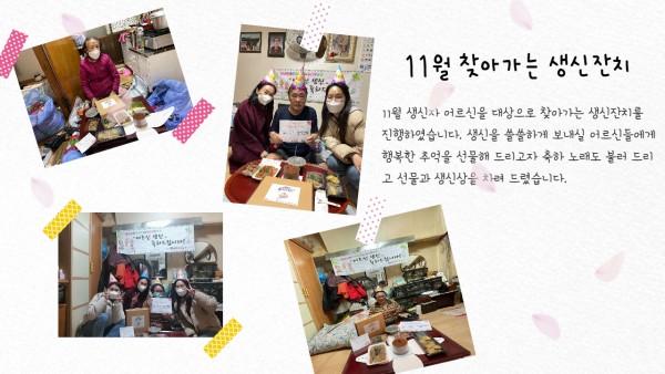 [재가노인지원서비스] 11월 찾아가는 생신잔치 페이지 정보 작성자 은천노인복지회 작성일21-12-15 17:21 조회20,640회 댓글0건 관련링크 이전글 다음글 목록 답변 본문 11월 찾아가는 생신잔치 이전글 다음글 목록 답변