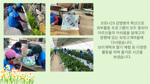 [재가노인지원] 봄 나들이 페이지 정보 작성자 은천노인복지회 작성일22-06-03 17:15 조회18,867회 댓글0건 관련링크 이전글 다음글 목록 답변 본문 재가노인지원센터 어르신들과 양평 보릿고개마을로 나들이를 다녀왔습니다. 이전글 다음글 목록 답변