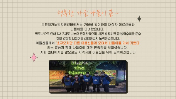 [재가노인지원서비스] 2021년 가을나들이 페이지 정보 작성자 은천노인복지회 작성일21-12-15 16:01 조회20,900회 댓글0건 관련링크 이전글 다음글 목록 답변 본문 2021년 재가노인지원서비스 대상 어르신 가을나들이 이전글 다음글 목록 답변